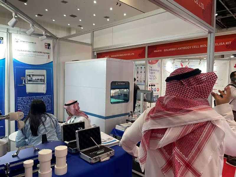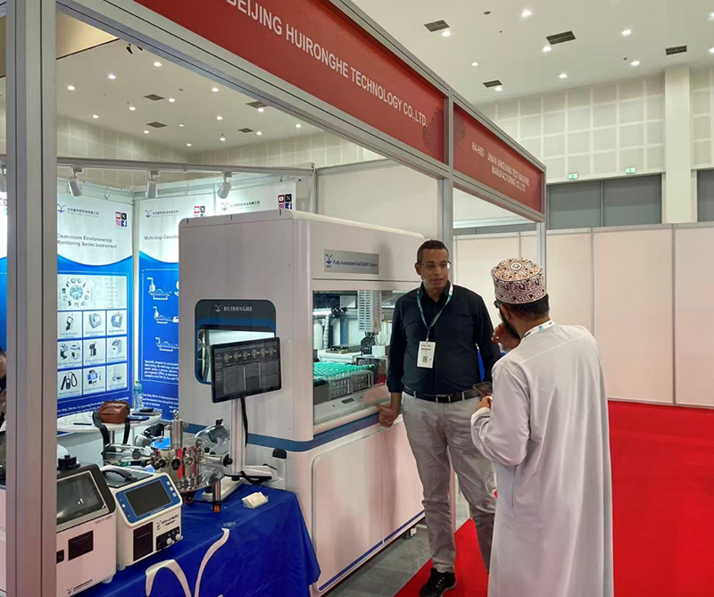 当前中东地区实验室数智化市场正处于快速增长期,沙特 “2030 愿景” 等区域战略为自动化设备带来巨大增量空间。作为国家级高新技术企业与中国制造冠军企业,慧荣和此次参展精准锚定中东市场需求爆发点,携全自动 QuEChERS 实验仪、气溶胶光度计、干雾过氧化氢消毒机、新一代药用圆盘撞击器、洁净室环境监测等多款明星设备再度参展,展现公司在实验室设备领域的开拓创新实力。曾获美国专利授权的全自动 QuEChERS 实验仪,一度成为展会现场焦点。工作人员现场开机演示,设备仅需简单设置操作即可完成传统数小时的人工实验,吸引了来自沙特、阿联酋、埃及等国的食品检测机构驻足洽谈,收获多家经销商的合作意向,部分已达成初步合作共识。